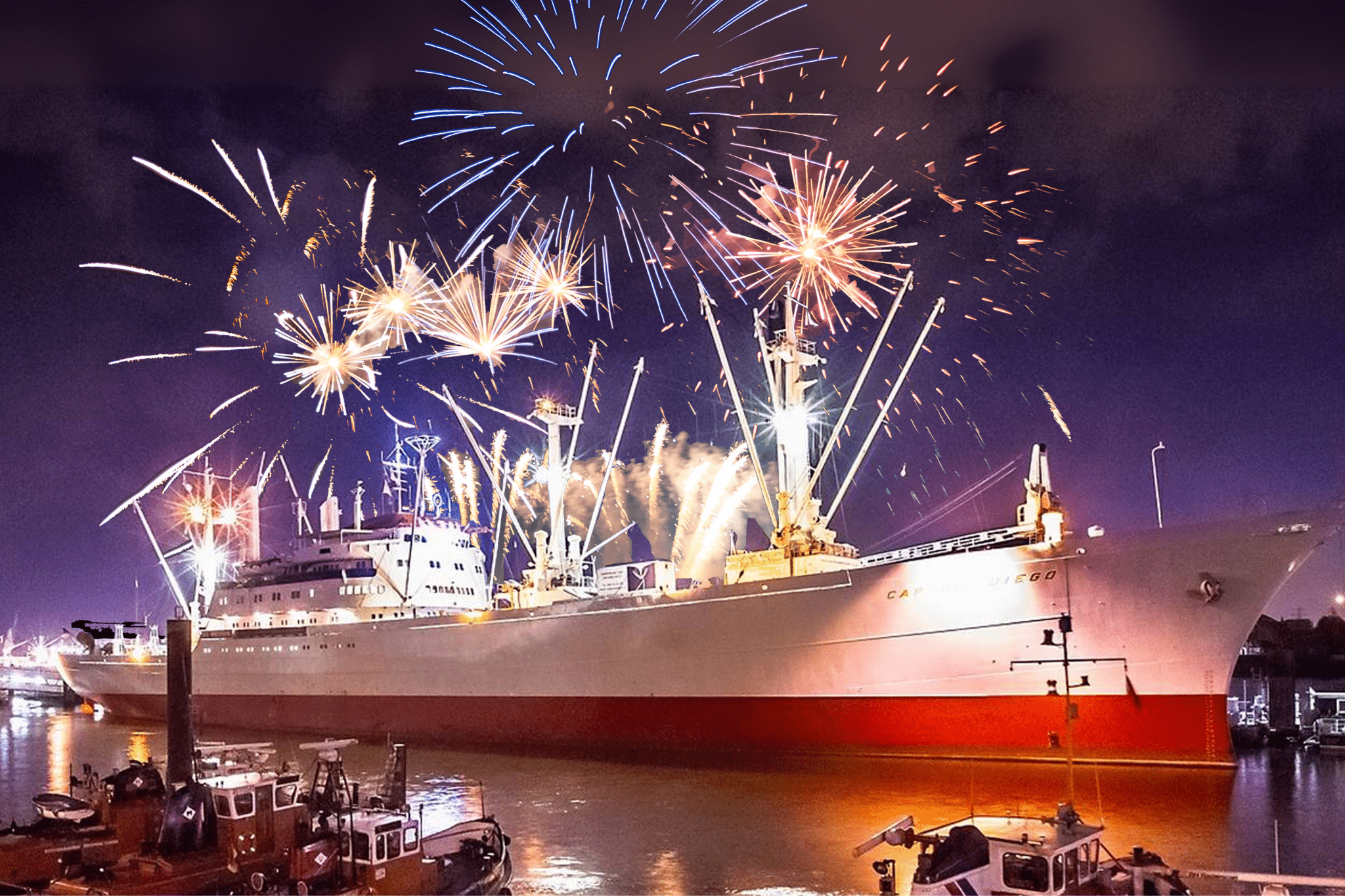 Freuen Sie sich auf Silvester 2025 an Bord der Cap San Diego – ein maritimer Jahreswechsel voller Musik, Feuerwerk und guter Laune im Herzen des Hamburger Hafens.