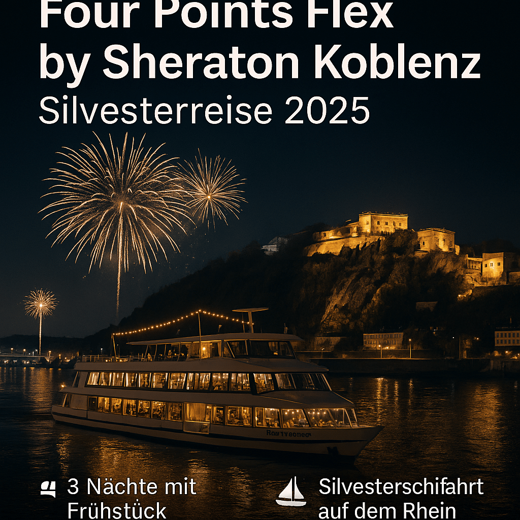 Sie wohnen im Four Points Flex by Sheraton Koblenz, einem modernen Stadthotel direkt gegenüber dem Hauptbahnhof, zentral zur Altstadt, dem Rheinufer und dem Deutschen Eck gelegen – ideal, um Silvester 2025 in Koblenz im Oberen Mittelrheintal in Rheinland-Pfalz zu erleben. Die Business-Zimmer sind modern ausgestattet mit Boxspring-Bett, Dusche, Klimaanlage, Schreibtisch, Sitzgelegenheit, Flachbild-TV, Safe, Telefon und Highspeed-WLAN. Morgens erwartet Sie ein reichhaltiges Frühstücksbuffet (Mo–Fr 6:30–10:00, Sa/So 7:00–11:00), an der stylischen Bar gibt es ein umfangreiches Getränke-Angebot. Parken ist in der Tiefgarage gegenüber mit direktem Zugang möglich, Hunde sind gegen Gebühr erlaubt. Diese zentrale Lage und die inkludierten Leistungen machen das Four Points Flex by Sheraton Koblenz zur überzeugenden Wahl für Ihren Jahreswechsel.