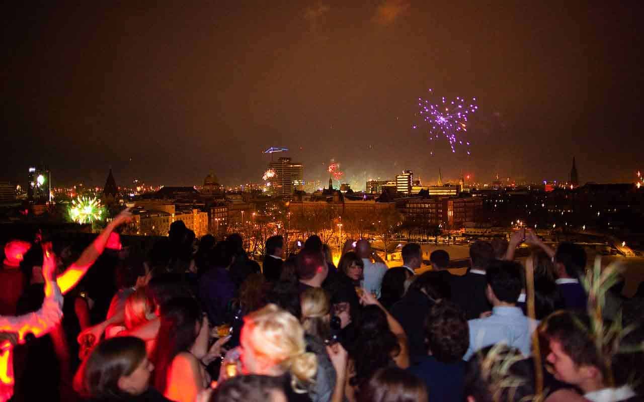 Die Dachterrasse ist DAS Highlight der Location. Zur Mittneracht gelangen Sie über zwei Treppen hierhin und erleben einen wahnsinnig tollen Ausblick. Sie blicken auf die Dächer der Stadt und den Silvesterhimmel, erleuchtet von den vielen Feuerwerken. Diese Kulisse ist wunderschön und es ist ein unvergessliches Erlebnis hier mit seinen Liebsten auf den Jahreswechsel anzustoßen. Während andere sich also den Kopf verrenken oder sich an öffentlichen Plätzen drängeln müssen, um einen schönen Blick zu erhaschen, stehen Sie weit über den Straßen und haben von hier aus einen guten Überblick über das Geschehen. WOW