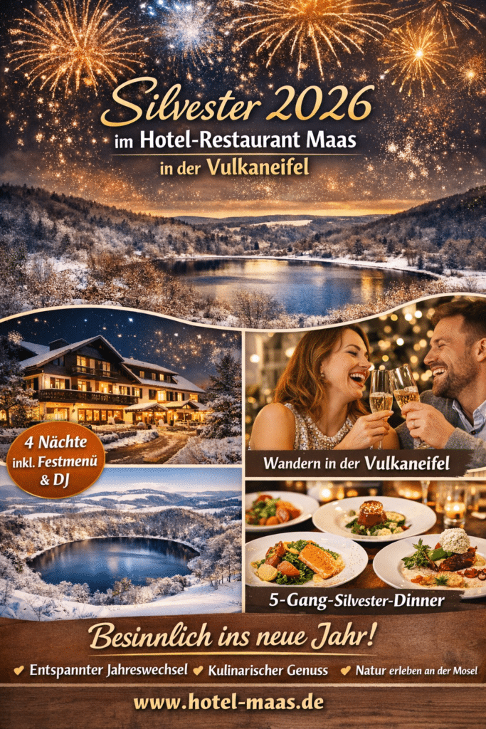 Silvester 2026 im Hotel-Restaurant Maas in Lutzerath Jahreswechsel in der Vulkaneifel mit Genuss und Natur Wer Silvester 2026 bewusst abseits voller Städte in ruhiger Umgebung verbringen möchte, findet im Hotel-Restaurant Maas in Lutzerath ein stimmiges Ziel für den Jahreswechsel. Das familiengeführte Haus liegt in der Eifel in Rheinland-Pfalz und verbindet eine persönliche Atmosphäre mit guter […]