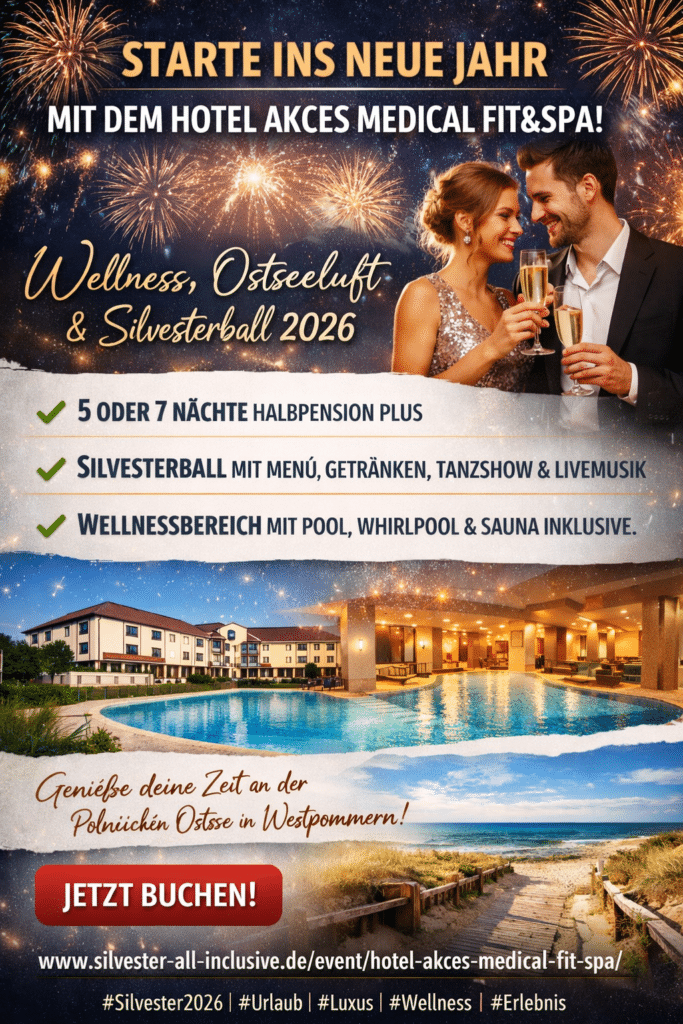 Silvester 2026 im Hotel Akces Medical FIT&SPA in Dźwirzyno – Ostseezeit zwischen Wellness und Silvesterball Winterfrische an der Polnischen Ostsee in Westpommern Wer das Jahr auf eine neue Art verabschieden möchte, findet beim Silvester 2026 im Hotel Akces Medical FIT&SPA in Dźwirzyno eine Mischung aus salziger Seeluft, Stille und festlichen Stunden. Das frühere Kolberger Deep […]