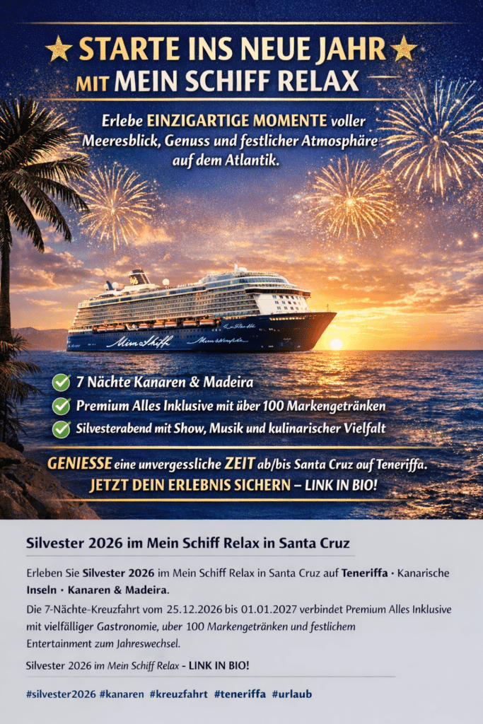 Mein Schiff Relax – Silvester 2026 auf den Kanaren & Madeira Warum eine Silvesterkreuzfahrt die stilvolle Alternative zum Winter ist Wenn der Jahreswechsel näher rückt, wächst bei vielen der Wunsch nach einem Ort, der sich leichter, wärmer und freier anfühlt als das klassische Silvester in der Heimat. Genau hier setzt die Silvesterreise 2026 auf der […]