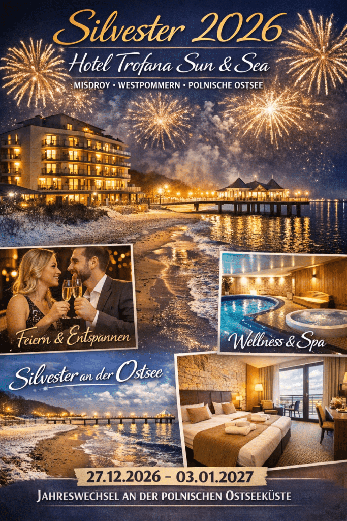 Silvester 2026 im Hotel Trofana Sun & Sea in Misdroy erleben Jahreswechsel an der Polnischen Ostsee mit Meeresrauschen Das Hotel Trofana Sun & Sea in Misdroy bildet für Silvester 2026 einen passenden Ort für eine Pause an der Polnischen Ostsee. Kurze Wege führen über 200 Meter direkt zum Strand und zur kalten Brandung. Frische Seeluft […]