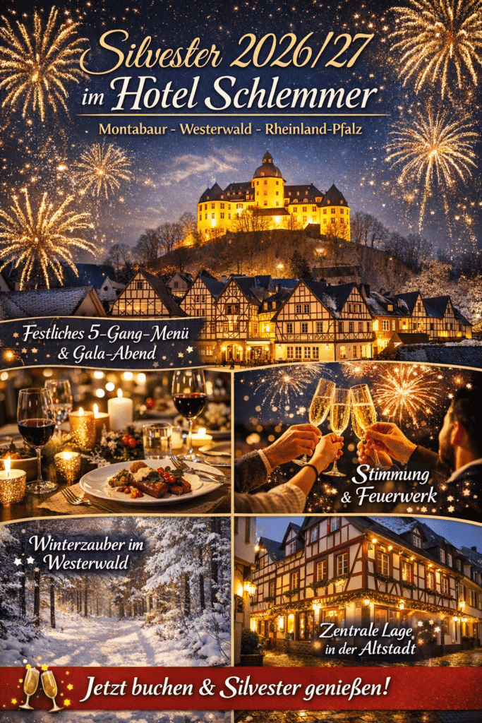 Silvester 2026 im Hotel Schlemmer in Montabaur – Altstadt, Genuss und Westerwald Wer den Jahreswechsel bewusst verbringt, findet mit Silvester 2026 im Hotel Schlemmer in Montabaur ein Paket für festliches Essen und ruhige Tage im Westerwald. Ihr Zimmer liegt mitten im alten Stadtkern in der Fußgängerzone. Montabaur zeigt sich zum Jahresende von seiner besten Seite: […]