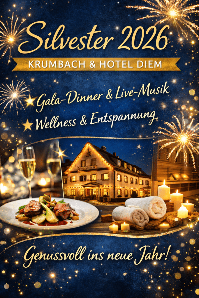 Silvester 2026 im Hotel Diem – Genussvoller Jahreswechsel in Mittelschwaben Ein Jahreswechsel voller Ruhe, Geschmack und schwäbischer Herzlichkeit Wer Silvester 2026 bewusst, entspannt und genussorientiert verbringen möchte, findet im Hotel Diem in Krumbach den idealen Ort dafür. Das familiengeführte Haus in Mittelschwaben steht für echte schwäbische Gastfreundschaft, eine angenehme Atmosphäre und ein Silvesterarrangement, das sich […]